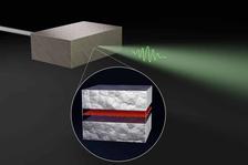 3D visualisation of the experiment: The iron atoms (red) are arranged in the X-ray waveguide in a layer about two atomic layers thick. The X-ray pulse (white) comes from the rear left, whereupon the atomic nuclei together emit a single photon (green waveform). (Credit: Leon M. Lohse)