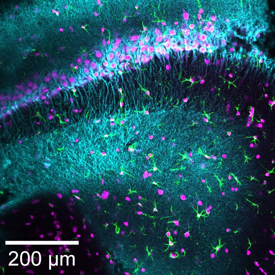 Detail from the figure below: densely packed neurons in triple-stained mouse brain tissue (see illustration below from: Marvin Edelmann/DESY).